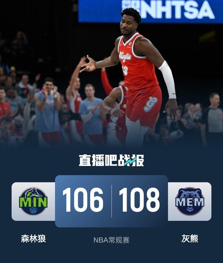 比赛开始,森林狼很慢热4分钟内一分未得,灰熊7-0领先,麦克丹尼尔斯扣篮止血,里德里突外投连续取分,灰熊突然断电,爱德华兹接连三分首节反超7分,次节双方命中率都有下降但还是展开拉锯战,爱德华兹联手里德助队拉开双位数领先,莫兰特和贝恩止血,半场森林狼领先11分。下半场,双方继续拉锯战,后半段森林狼进攻端受阻,灰熊替补全民皆兵连续追分,三节灰熊追到差5分,末节灰熊一度追到差1分,迪林厄姆成为奇兵,里突外投连砍7分联赛里德助队稳住局势,但小贾伦-杰克逊接连攻击内线得分上双还能助队咬住比分,随后灰熊接连罚球11-0反超比分,里德连得5分止血,爱德华兹绝杀三分不中,最终灰熊108-106逆转森林狼。