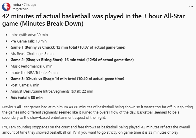 今日改制后的全明星正赛引来多方吐槽,甚至有网友晒出了今日的实际比赛时长,结果也是相当夸张。