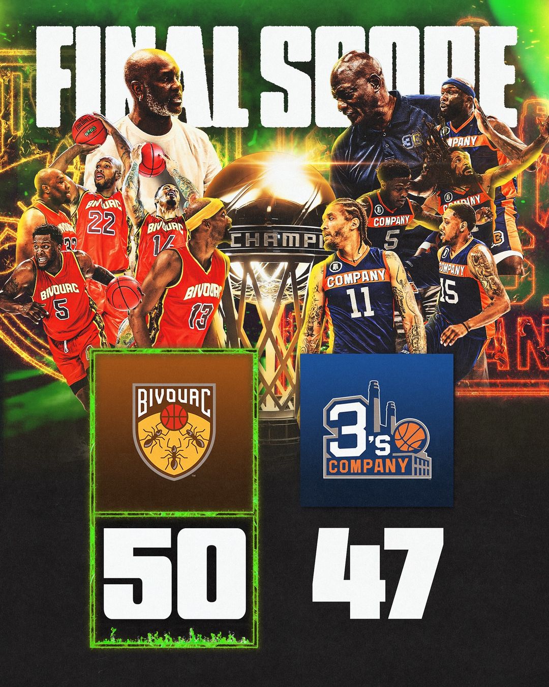 在上赛季的BIG3联赛的冠军战中,由老加里-佩顿执教,杰拉德-格林和科里-布鲁尔等人领衔的Bivouac队50-47绝杀了由迈克尔-比斯利和查尔莫斯等人领衔的3's Company队。