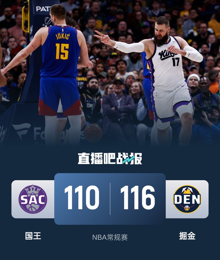 比赛开始,双方进入状态都较快,国王接连三分命中取得领先,但约基奇有攻有传给出回应,拉拉维亚上来连中3记三分,国王打出15-4攻击波领先13分,次节国王进攻端有些停滞且连续失误,掘金上来8-0止血,德罗赞始终没有手感,好在国王其他人发挥不错能回应,半场国王依然领先10分。下半场,掘金首发五虎合力开始追分,但德罗赞找回状态,单节扔进4记三分怒轰18分,国王三节依然领先9分,末节威少接连突破取分,掘金打出12-3直接反超比分,但德罗赞和拉文接连中投回应,比赛进入白热化,贾马尔-穆雷和约基奇接连造杀伤8-0反超5分,拉文接连三分后关键中投不中,最终掘金116-110逆转国王,终结对手4连胜。