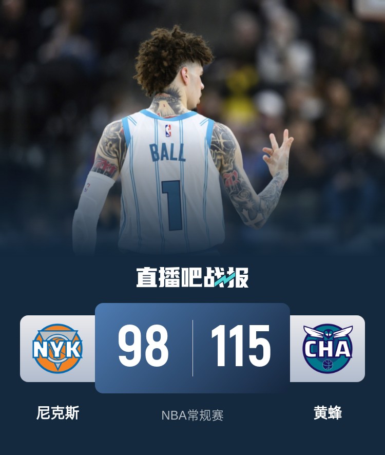 上半场,黄蜂率先发力打出9-2的开局,尼克斯内外开花反超比分, 黄蜂一波8-0稳住局势,次节双方围绕10分分差展开拉锯战,尼克斯不断冲击内线,黄蜂连投带罚强势回应,半场战罢尼克斯44-54落后黄蜂。下半场,黄蜂内外开花牢牢占据场上主动,尼克斯里突外投顽强追赶,末节两队继续围绕两位数的分差展开激烈争夺,黄蜂持续发力扩大优势,马威攻防两端建功,锡伯杜在比赛还剩2分钟时换下主力投子认负。最终,尼克斯98-115不敌黄蜂,客场落败。