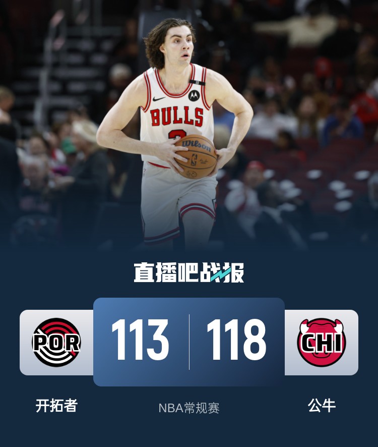 比赛上来,两队就打得相对胶着,公牛虽然保持微弱领先却无法拉开分差,开拓者抓住机会在节末更是完成反超,次节公牛先拿五分稳住局势,之后两队一直保持拉锯,场上比分交替领先,半场结束时开拓者还领先2分;下半场回来,开拓者依旧能够咬住比分,不过在三节后半段他们还是败下阵来,这一节公牛攻势如潮单节轰下40分,末节开拓者虽有追分势头但终究未能完成逆转,最终公牛力克开拓者取得连胜。