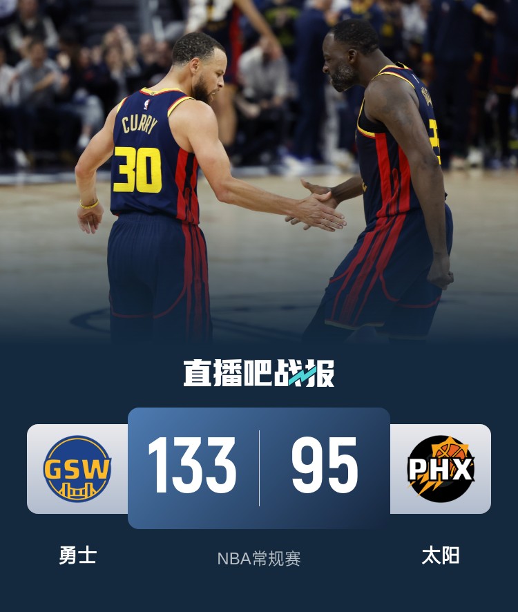 勇士(47-32):库里25分9板6助、波杰姆斯基22分5板3助、戴维斯13分8板1助、库明加10分3板3助、斯潘塞10分2板4助、巴特勒10分2板3助2断、诺克斯10分2板1助、桑托斯7分9板3助2断、希尔德7分4板1助、罗6分3板1助、穆迪5分3板2断、格林5分2板4助2断、卢尼2分4板1助、基1分1板。