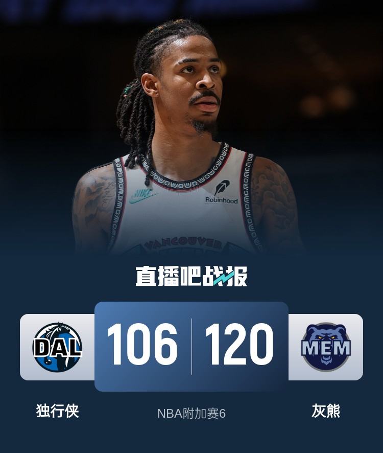 首节之争灰熊明显做足准备上来就是一波20-10的攻势拉开比分抢占先机,首节灰熊各方面数据几乎全包围对手占据绝对上风;次节他们又以一波10-0的攻势将分差拉大至25分;浓眉哥关键时刻站出来力挽狂澜拿下14分止住溃败局势蚕食分差,但灰熊此时依旧大比分领先并带着17分优势进入下半场。休息归来浓眉哥和克莱相继命中三分一度追至个位数,不过末段轮换还是棋差一招,灰熊回敬21-10的攻势重新拉开分分差,末节贝恩连拿5分将优势扩大至20分奠定胜局。最终,灰熊主场击败独行侠顺利拿下附加赛胜利,从而以西部第八的身份晋级季后赛,他们的首轮对手将是西部第一的雷霆。