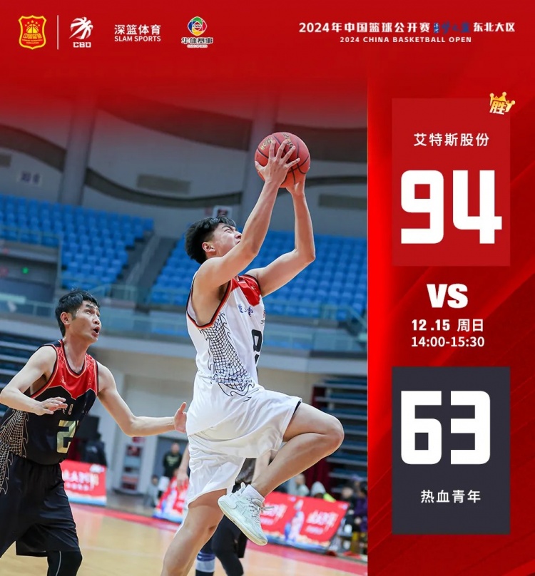 上半场开局热血青年6号刘昊宸连线5号宋健彰取得三分球开门红,艾特斯股份不甘示弱,攻势猛烈,多次打出精妙配合,狂轰54分。下半场,热血青年受体能影响,进攻屡屡受阻,艾特斯股份15号王猛、11号张继龙、9号于一帆火力全开,三人均得分上双,最终比分94-63,艾特斯股份拿下首场胜利。