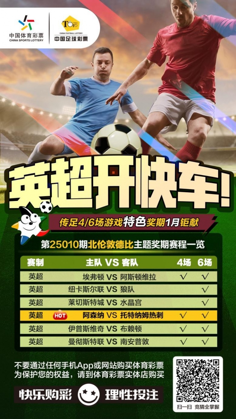 第25010期传足4/6场游戏特色奖期已经于2025年01月12日20:00开售,将于2025年01月15日22:00停售,并于01月17日开奖,其中埃弗顿VS阿斯顿维拉、阿森纳VS托特纳姆热刺、伊普斯维奇VS布赖顿和曼彻斯特联VS南安普敦为4场进球游戏竞猜赛事。