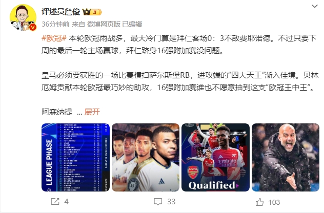 01月23日讯 欧冠第七轮对阵全部结束。赛后,评述员詹俊发文点评。