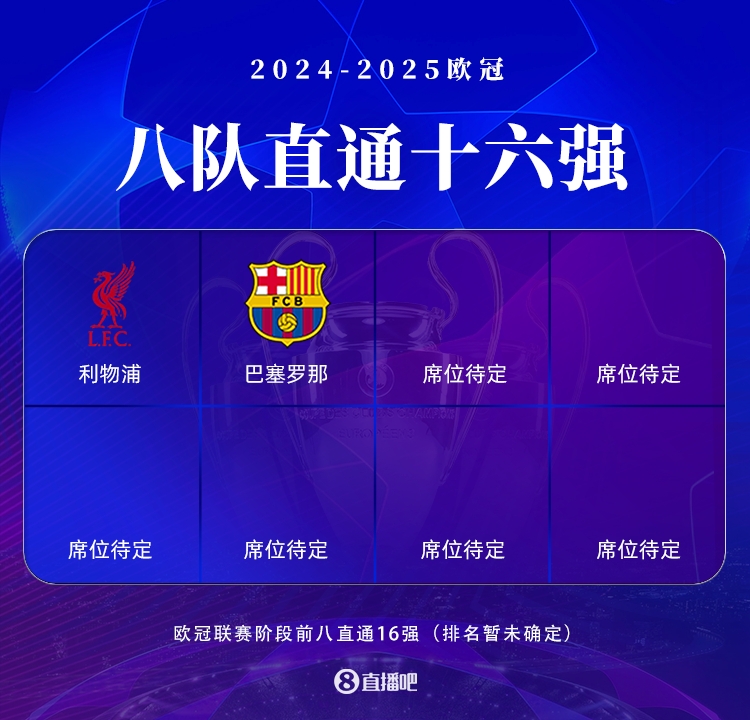 1月23日讯 欧冠联赛阶段第七轮结束,欧冠官网更新积分形势,仍只有利物浦和巴萨确定提前晋级。