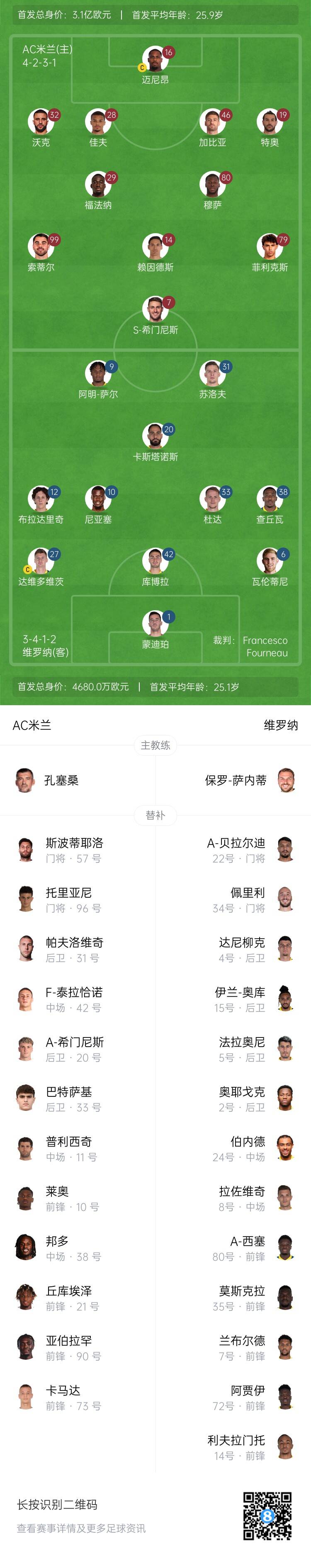 2月16日讯 意甲第25轮,AC米兰主场对阵维罗纳。赛前,官方公布了本场的首发名单。