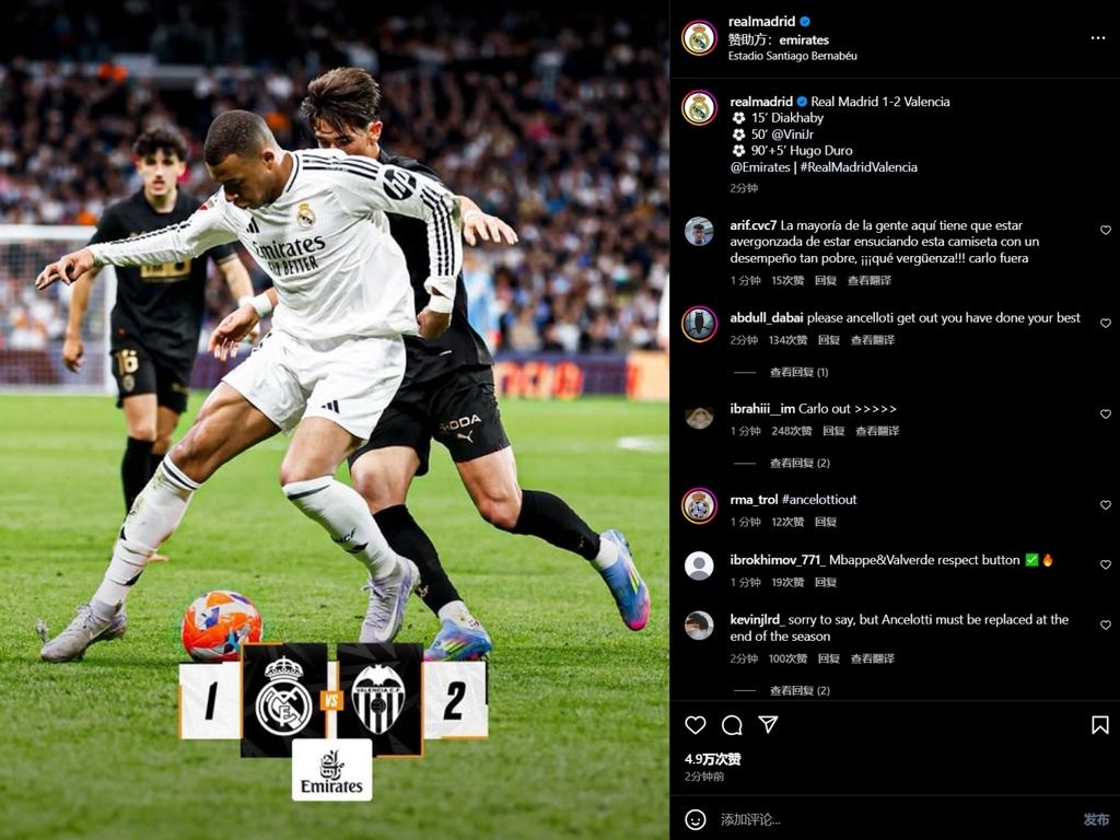 04月06日讯 皇马本轮1-2遭瓦伦绝杀。赛后,皇马在社媒的战报被刷屏,皇马球迷在刷安切洛蒂下课!部分内容如下。