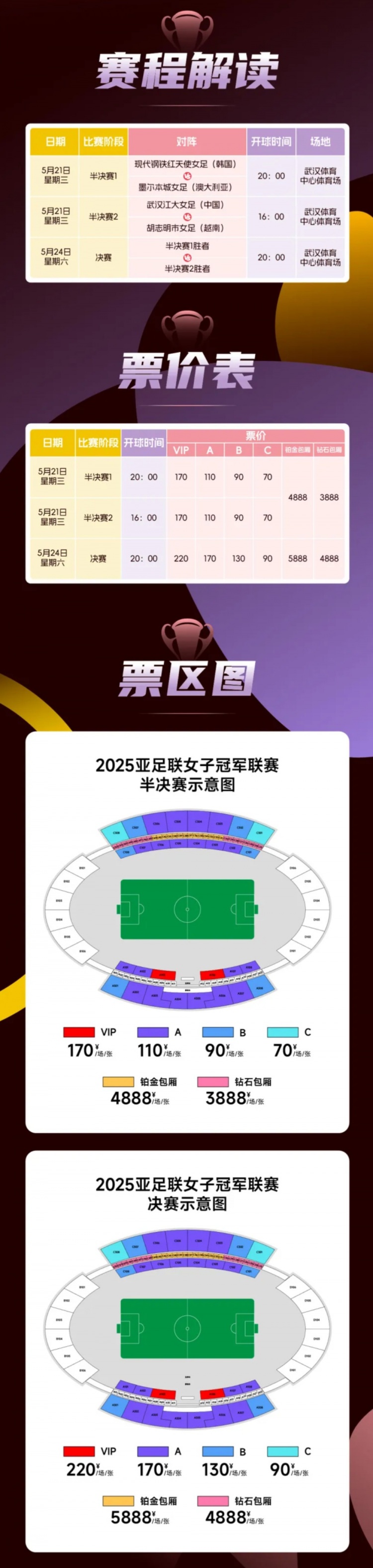 5月12日讯 武汉体育官方消息,女足亚冠决赛开票仪式昨天进行,决赛票价最低90元。