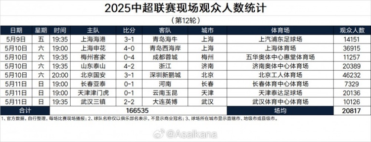 5月12日讯 中超第12轮所有比赛于昨晚落下帷幕。根据德转朱艺统计,本轮武汉三镇主场2-2战平大连英博的比赛中,共有10126名球迷来到三镇主场观战。