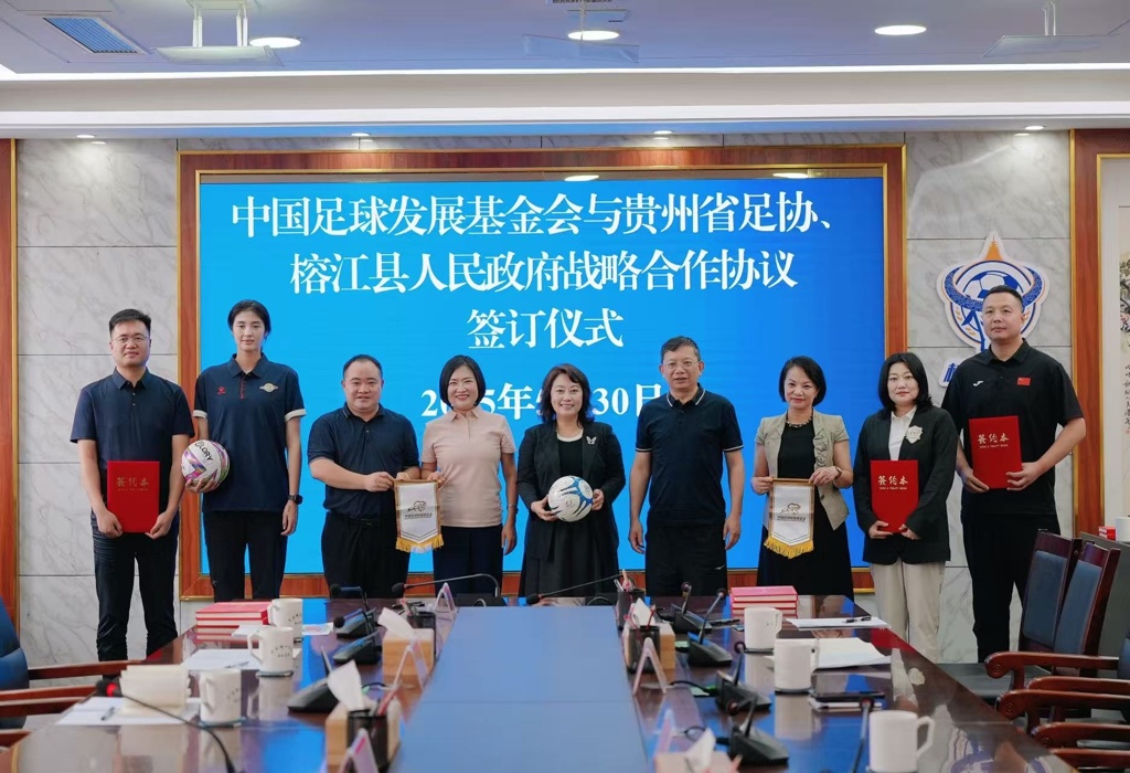2025年5月30日,中国足球发展基金会与贵州省体育局战略合作协议签约仪式在贵州省榕江县举行,双方将围绕共同打造贵州青少年足球赛事品牌、助力“村超”品牌可持续发展、面向留守儿童设立“爱苗计划”、推出“足球支训计划”等6个领域开展为期五年的合作。同时,中国足球发展基金会还与贵州省足球协会、榕江县人民政府三方就设立“村超”发展基金、设立“村超”足球学院等签署战略合作协议。中国足球发展基金会理事长王小朋,贵州省体育局党委书记、局长马雷,贵州省体育局二级巡视员朱俊华,黔东南州人民政府副州长王建华,榕江县委书记徐勃,榕江县委副书记、县长王飞,前国家女足门将赵丽娜及爱心企业代表出席签约仪式。