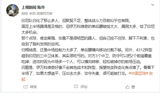 上观新闻陈华在社媒表示:“印尼队归化了那么多人,但默契不足,整体战斗力目前似乎也有限。
