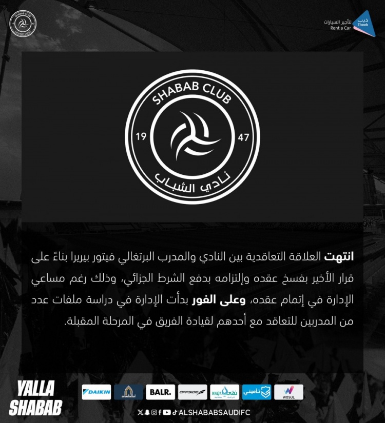 沙特俱乐部利雅得青年人发布公告表示,俱乐部努力挽留维托尔-佩雷拉,但这位葡萄牙教头决定终止合同,并承诺支付解约金。根据此前媒体的报道,佩雷拉将成为狼队的新任主帅。