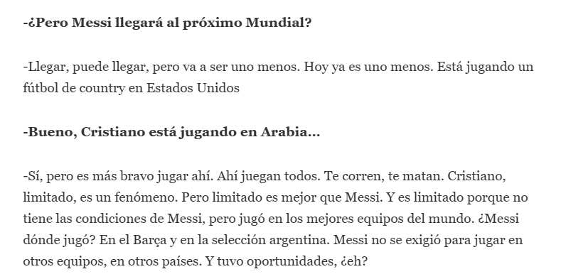 (Messi no me cae mal, pero jugó en un fútbol fácil. Yo lo veía a él en un Barcelona que le pitaban todo, que nadie le daba una patada, que tenían un equipo bárbaro que jugaba para él.)