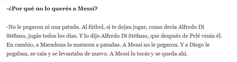 "在足球中,如果对手让你(自由)踢,就像迪斯蒂法诺说的,你每天都能踢好球。另一方面,马拉多纳被人踢得遍体鳞伤。梅西没有受到这样的对待。马拉多纳被踢倒了还能爬起来,但你稍微碰一下梅西,他就倒在那里。"