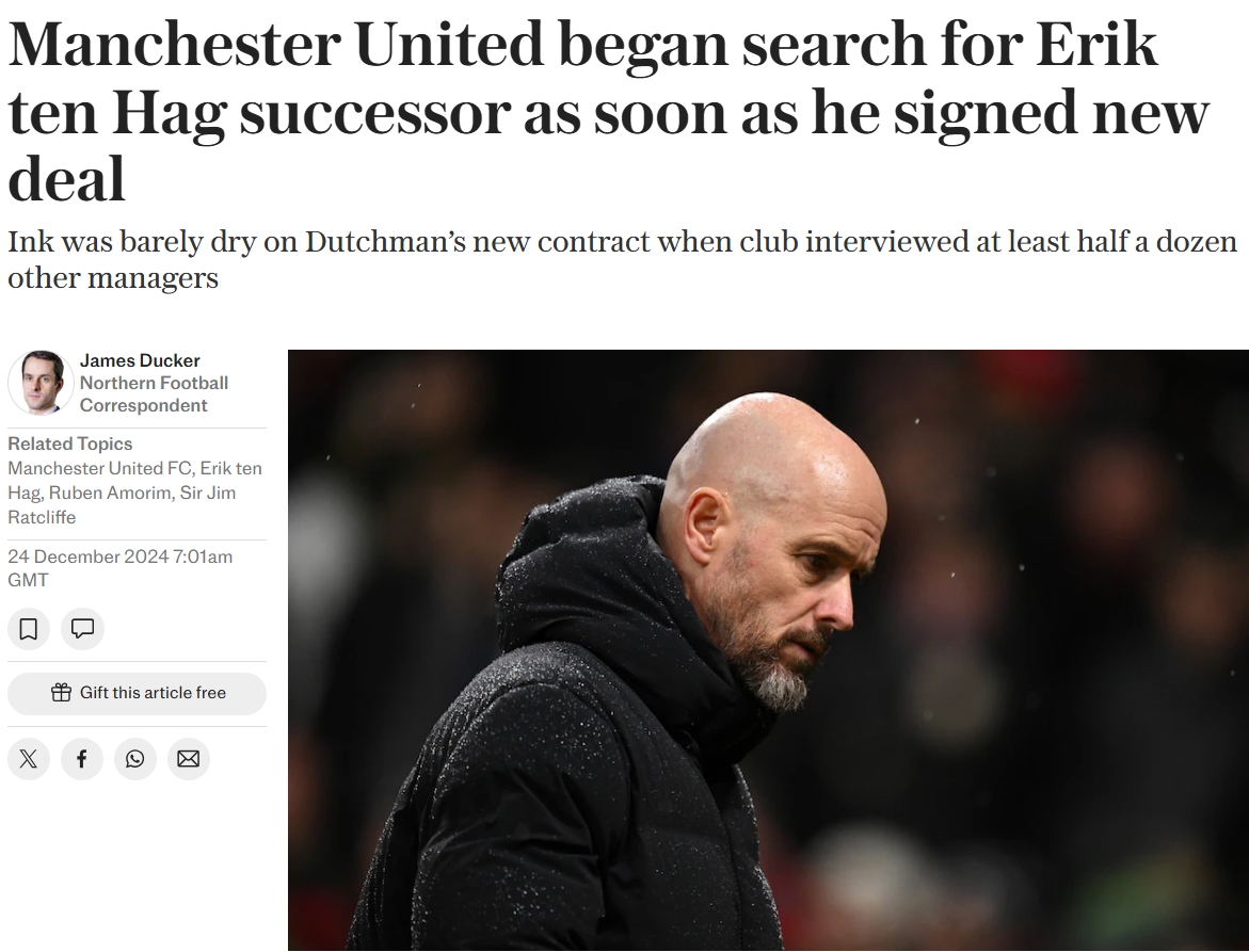 《电讯报》报道称,在滕哈赫续约后不久,曼联就开始为他可能的继任者做准备。最终滕哈赫在10月28日被解雇,仅仅4天后阿莫林就被正式任命为曼联新任主帅。